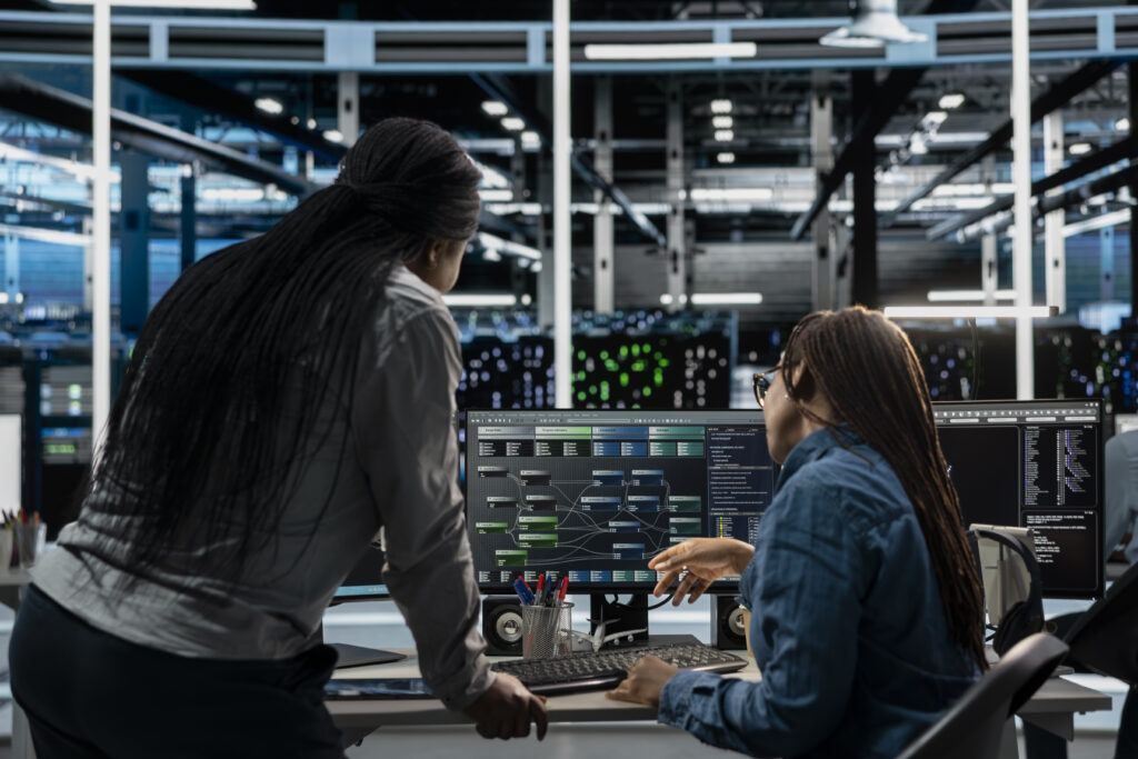 Server room manager overseeing work done by engineer using artificial intelligence to reduce downtime. Team leader supervising employee implementing AI driven solutions for data center equipment